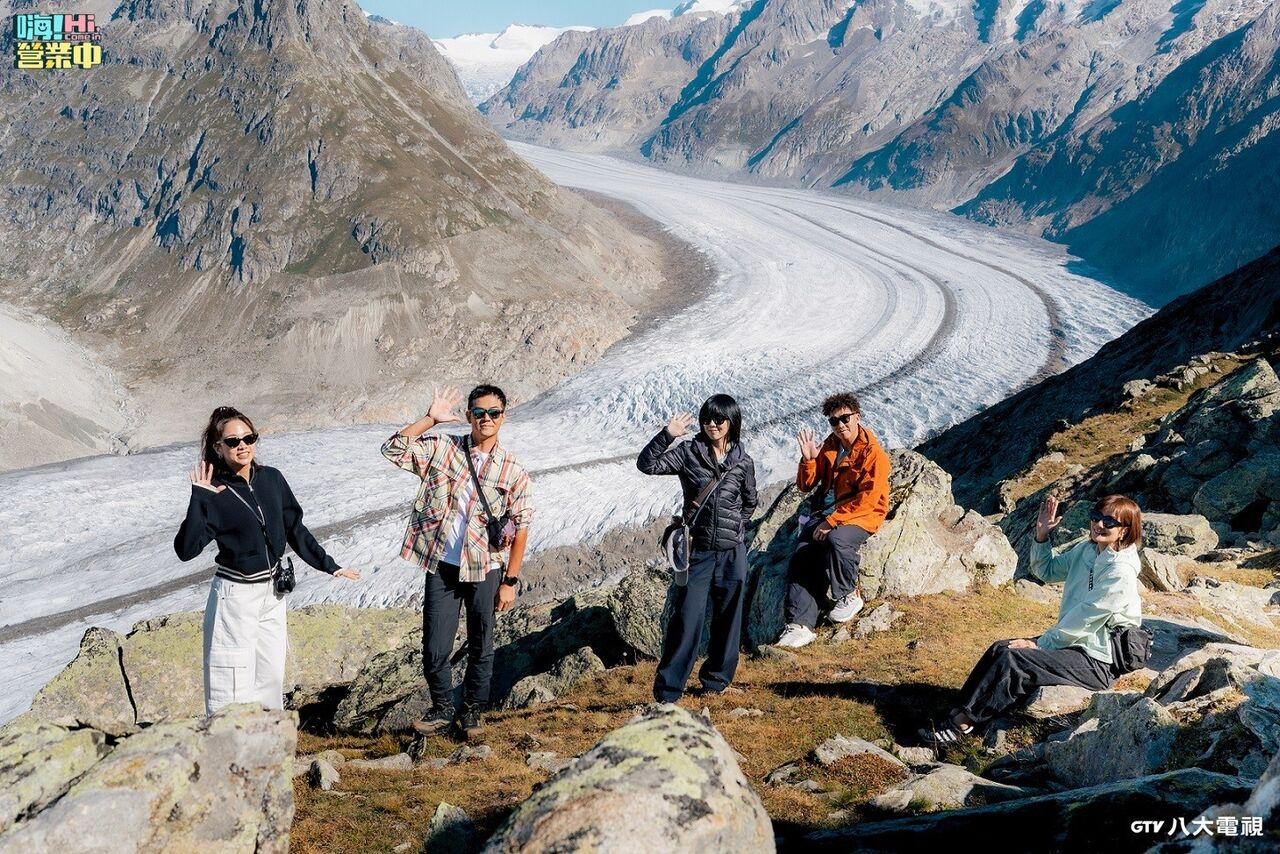 ▲吳映潔(左起)、姚元浩、白安、郭泓志、莎莎隨《嗨!營業中》節目到瑞士。(圖/八大提供)