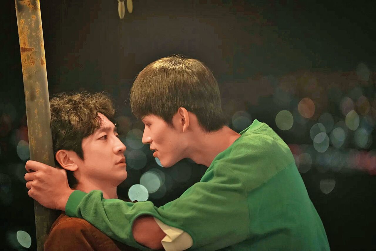 ▲王品澔(右)在《拜六禮拜》中上演BL劇情,也順勢炒了一下性向之謎。左為葛丞。(圖/華視提供)
