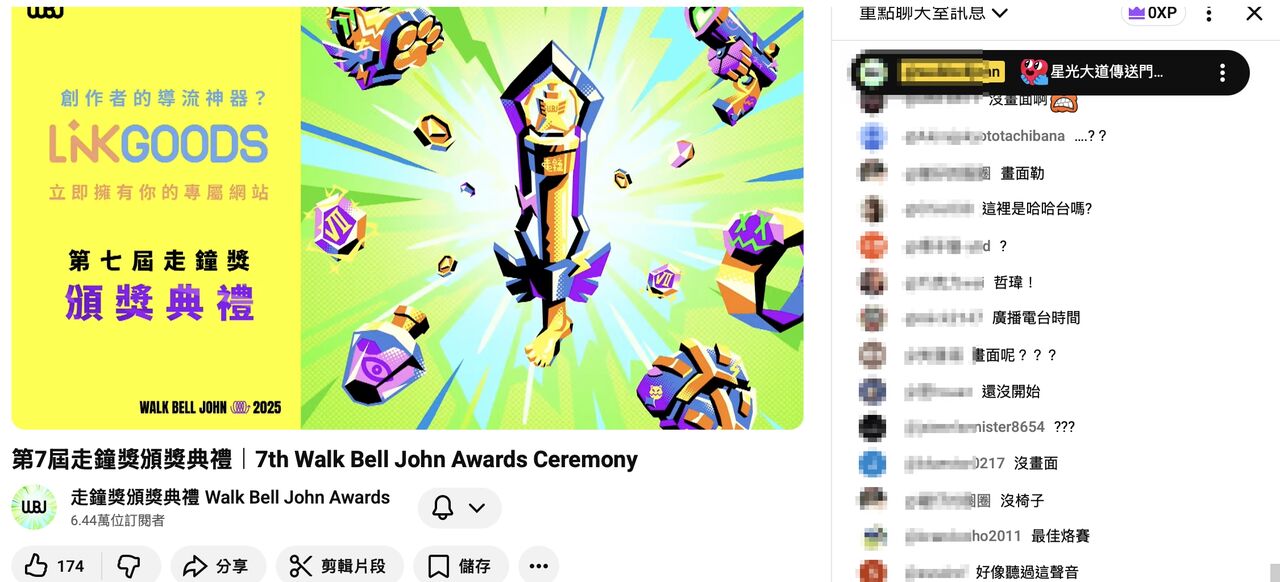 開場表演嘉賓則由新生代嘻哈歌手Gummy B擔任,一現身就吸引5000人上線,不過畫面也遭網友吐槽「字體太醜」,更有人開酸:「是不是沒有金費」,讓走鐘獎還沒開始就掀起討論。