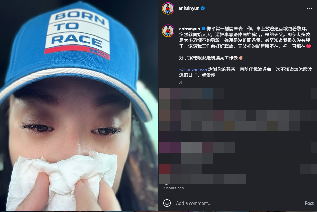 安歆澐在社群網站透露,她剛剛其實和平常一樣,準備開車去工作,沒想到一聽到歌手璽恩的歌曲,「突然就開始大哭」,只好先將車子靠邊停。
