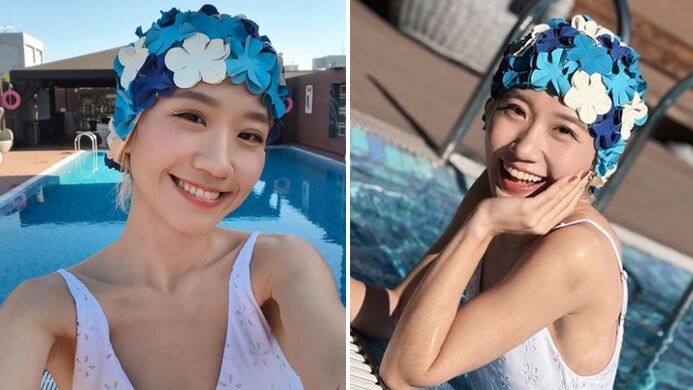 格外引發討論的,莫過於Lulu頭上戴的泳帽,上頭佈滿立體的花瓣造型,配色是深藍、湖水藍、白色三色交錯,像小花海一樣圍在頭上,設計不但吸睛,也讓整體多了趣味與復古魅力。
