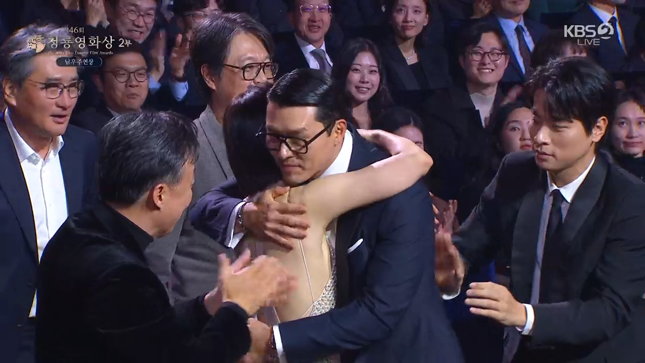 台下坐滿劇組演員,他把獎項榮耀分享給同事們。並在最後告白妻子「只要存在就能給我力量的妻子藝真,以及我們的兒子,我想對你們說,我非常愛你們,也謝謝你們。」