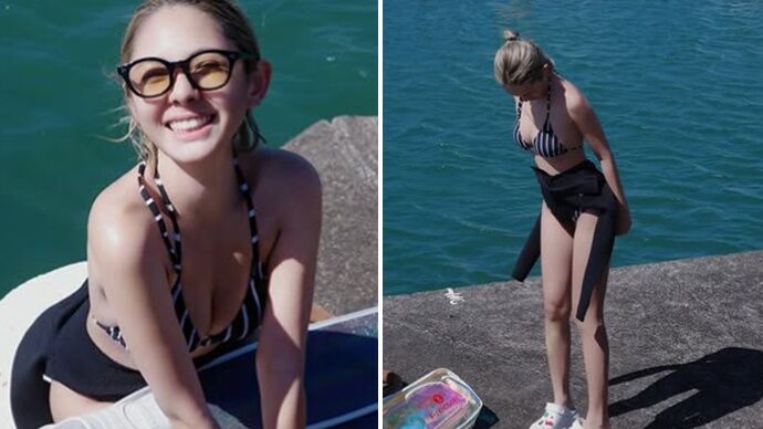 照片中,可以看到鮪魚潛水衣裡面身穿黑白條紋比基尼,搭配高腰黑色泳褲,窈窕曲線全被看光光。她手中拿著潛水裝備,散發出健康陽光的魅力。