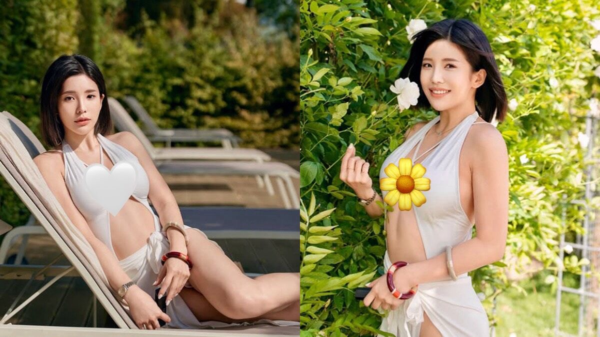 照片中可見到,壯壯身穿一件純白色的深V洋裝,火辣上圍一覽無遺,側邊剪裁大膽,腰間圍著一條白色薄紗的布料,增添柔和感。壯壯的手上戴著手環,替整體造型增加亮點。她時而雙腿交疊半躺在躺椅上,將手自然放在腿上,姿勢放鬆相當又愜意。在其他照片中,壯壯站在茂密的綠葉旁,一手拿著白花,像是在享受戶外的好天氣。