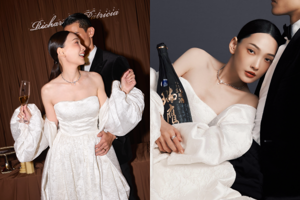 晚宴部分,林映唯以Heli Kalkstein的蕾絲透紗禮服性感亮相,細緻蕾絲與若隱若現的透紗勾勒出迷人輪廓,散發法式般的自然性感。搭配CHANEL高級珠寶COCO CRUSH耳環及戒指,標誌性菱格紋線條與透紗質感相互呼應,將優雅與性感平衡得恰到好處。Richard則以CHANEL高級珠寶COCO CRUSH戒指與單邊窄版圈式耳環,延續俐落風格,低調卻不失細節。