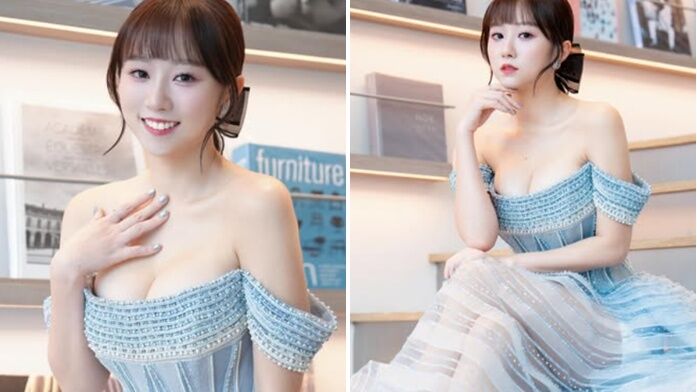 照片中,可以看到斐棋身穿一襲淡藍色禮服,相當映襯她的白皙膚色;上半身細緻的低胸編織設計,完美襯托出呼之欲出的北半球,收腰設計勾勒出纖細腰線。