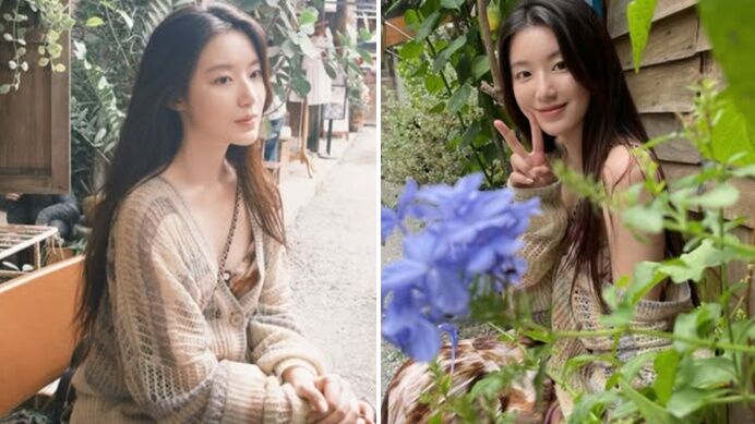 照片中,可以看到舒華身穿一件寬鬆的米色鏤空針織外套,不時從肩膀滑落,增添慵懶氣息之外,也若隱若現出內搭的大地色系的細肩帶長洋裝,低胸剪裁小露性感。