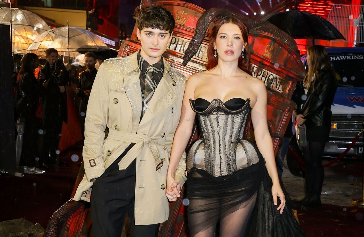 ▲米莉芭比布朗(右)與諾亞許納普(左),攜手走上《怪奇物語5》倫敦首映的紅毯,散發出成熟的氣質。(Netflix提供)