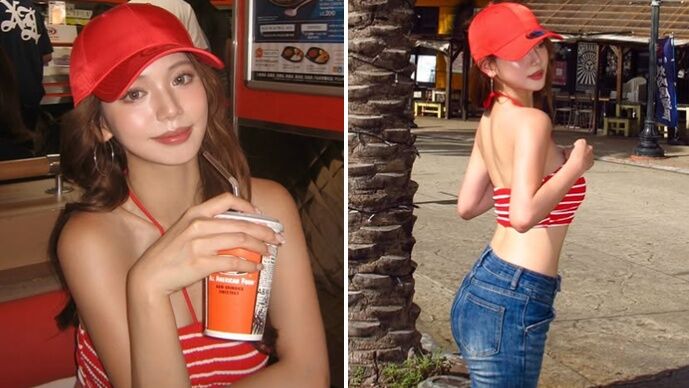 照片中,可以看到庭庭上半身穿著紅白條紋的繞頸式小可愛,相當映襯她的健康膚色之外,也完美襯托出漂亮的肩頸線條與纖細腰身,再戴上一頂紅色棒球帽,讓整體造型更加一致。