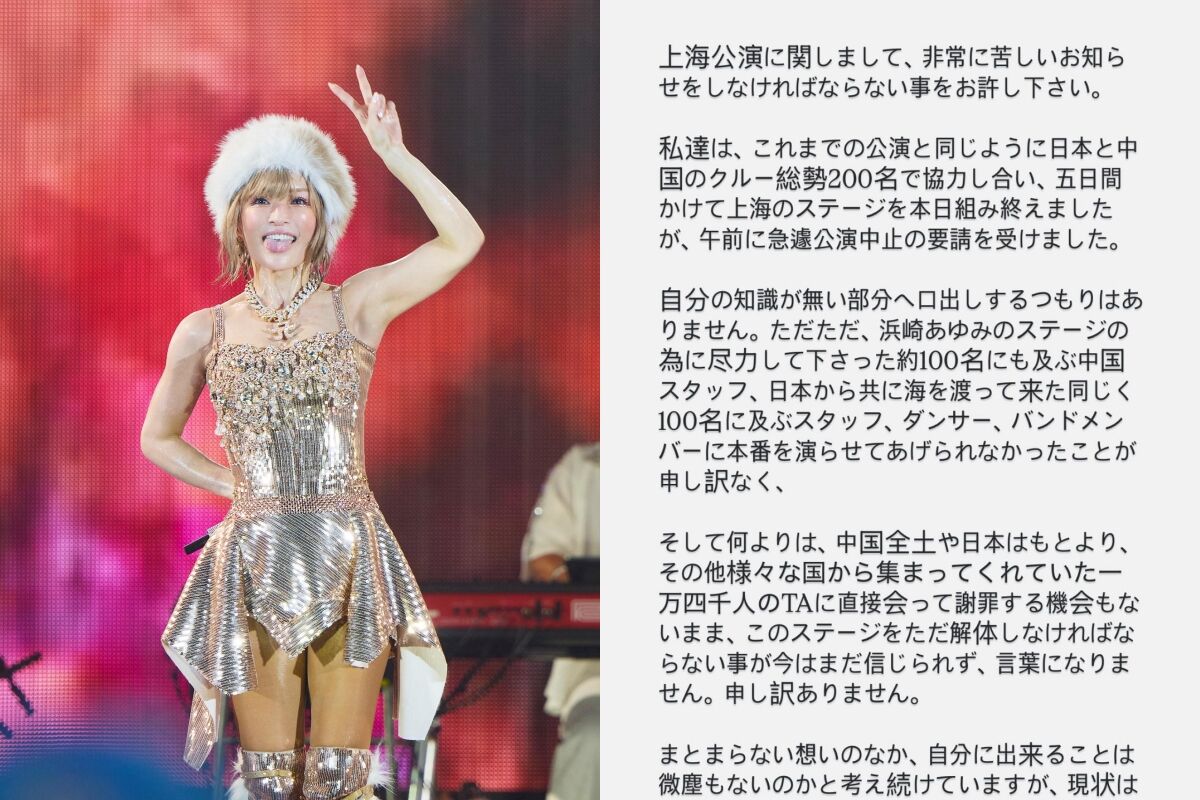 近來中日關係緊張,風波也燒進演藝圈,兩國藝人都因情勢取消到對方國家的演出。而日本天后濱崎步的上海演唱會原訂要照常進行,甚至工作人員也已經將舞台搭好,沒想到卻在開演前一天被迫喊卡,濱崎步也對此無奈發聲。