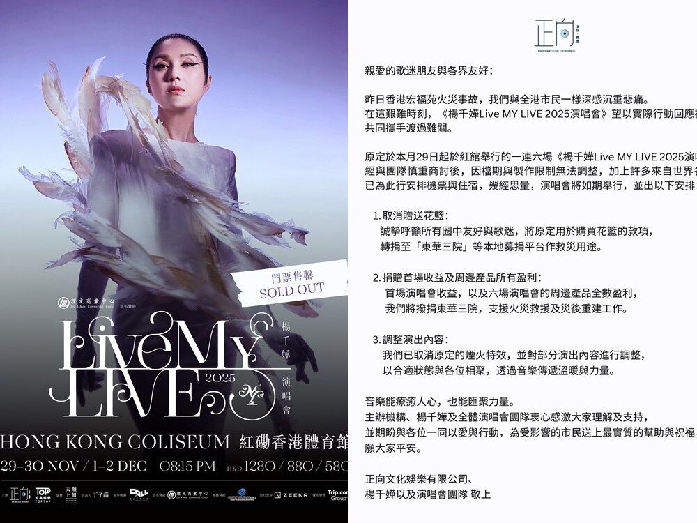 香港大埔宏福苑惡火造成128人死亡,上千個家遭燒毀,全港氣氛低迷,演藝圈多項娛樂活動紛紛宣布暫停哀悼。而歌手楊千嬅原定今天(29)起在紅館連續舉辦6場演唱會,門票早已售罄,因檔期無法調整宣布「如期舉行」,雖然團隊祭出捐出首場收益、取消煙火特效等配套措施試圖緩解觀感,但此決定仍引來部分網友怒火。