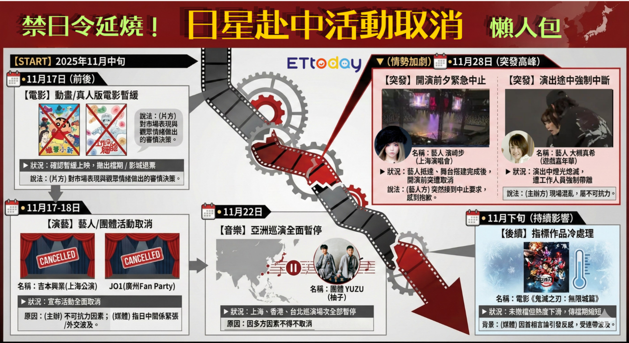 從日本喜劇藝人、人氣男團JO1及YUZU,到殿堂級天后濱崎步,以及跨世代動漫主題曲歌手大槻真希都遭殃,原訂演出不是被喊卡、就是在台上被迫中斷。電影院線方面,包含《蠟筆小新:燒熱的春日部舞者們》、《真人版〈工作細胞〉》與《鬼滅之刃:無限城篇》部分檔期也被調整或撤檔,官方多以「暫緩上映」及「綜合市場評估」等說法帶過。