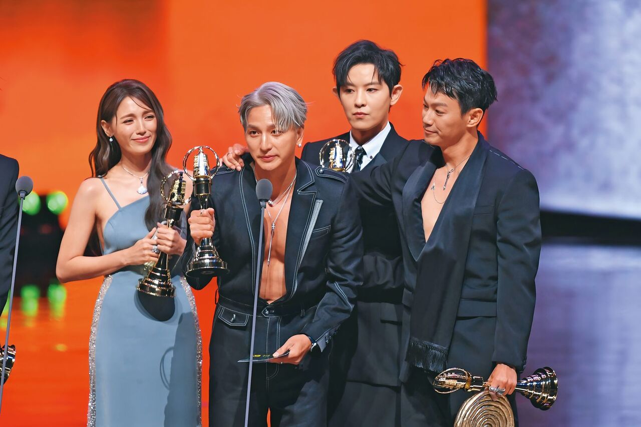 ▲棒棒堂小煜(左二)10月才在金鐘獎舞台上對家人感性發言,沒想到當時他已和老婆離婚。左起為朵拉、敖犬與威廉。(三立提供)