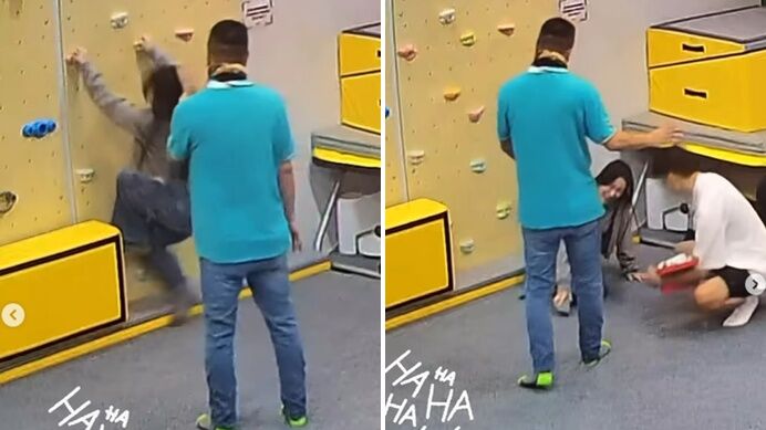 畫面中,可以看到Apple當天穿著灰色外套和寬鬆牛仔褲,原本按照老師的指示,爬上室內攀岩牆後示範受傷,未料踩地時沒有踩穩,導致腳踝拐了一下。