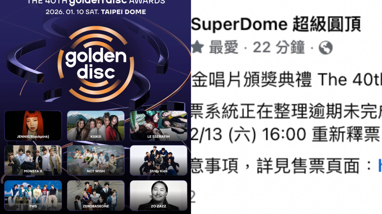 南韓樂壇年度盛事「第40屆金唱片頒獎典禮(Golden Disc Awards)」將於2026年1月10日首度攻進臺北大巨蛋,門票採實名制販賣,並於13日中午11點半準時開賣,稍早,大批粉絲湧入售票網站搶票,一家歡喜一家愁,有人搶到票也有人哀嚎不斷,主辦「超級圓頂」也同步公開下午4點還有清票,粉絲可把握最後搶票機會!