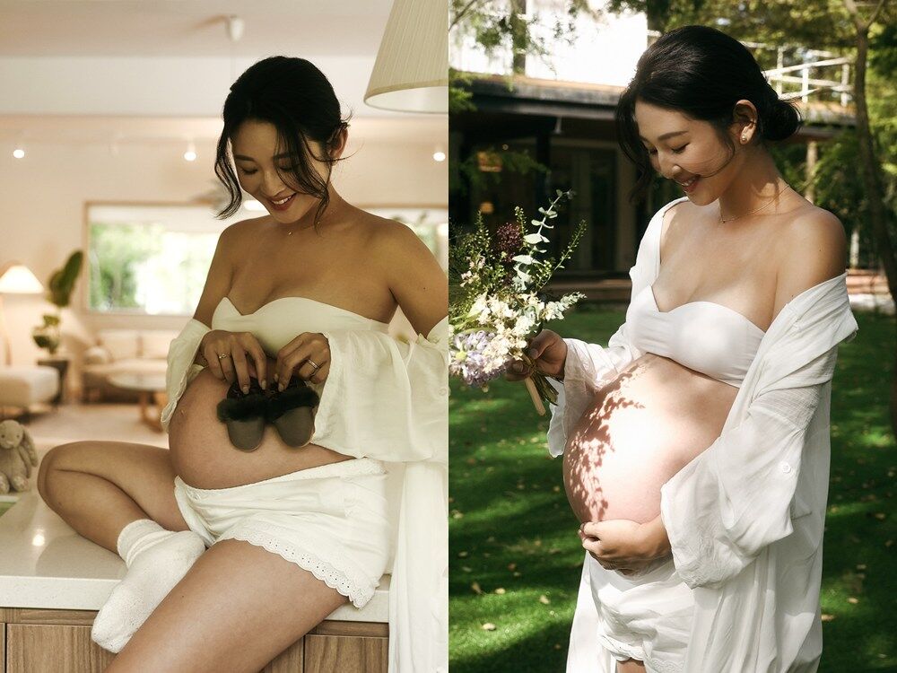 照片中,Ivy身穿純白色的平口抹胸與短褲,或是披著慵懶的針織外套,自在地在屋中、綠色庭院取景。她9個月大的孕肚又大又圓潤,更洋溢著即將為人母的幸福笑容,最令人注目的是,儘管懷孕來到後期,她的手臂與雙腿線條依舊緊實纖細,鎖骨更是清晰可見,整個人散發出柔美而堅毅的光輝。她手拿著深色嬰兒鞋放在肚皮上,溫柔地低頭凝視,畫面溫馨感人。