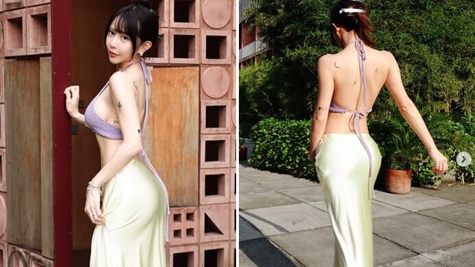一轉身,梓梓進一步揭曉這套服裝的另一個「小心機」。只見她漫步在陽光灑落的步道上,大露背設計僅用幾條細繩繫住,讓她的白皙美背完全展露,還能清楚看見她背上的月亮圖案與手臂的愛心刺青,為這份性感增添了幾分個性與神秘感。
