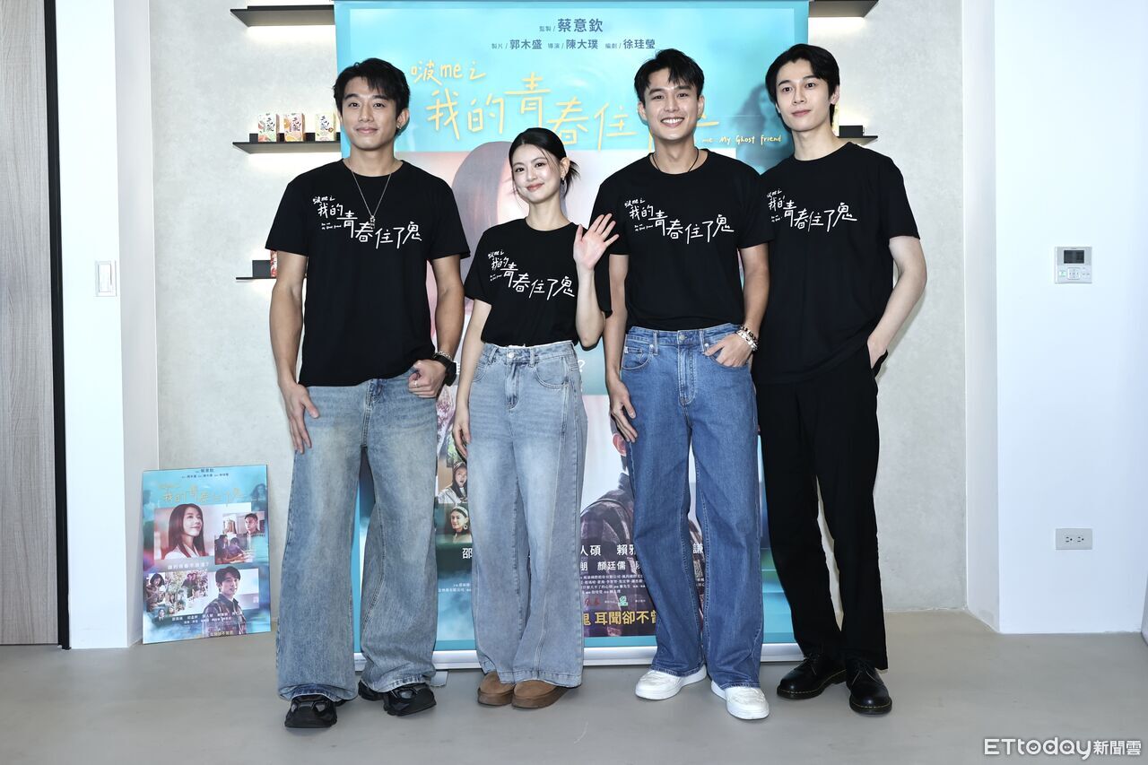 ▲《啵me之我的青春住了鬼》初孟軒(左起)、陳昱廷、安俊朋、顏廷儒。(圖/記者徐文彬攝)