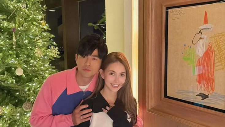 照片中,可以看到周杰倫身穿亮眼的粉紅與藍色拼接針織外套,雙手摟著身穿黑白配色服裝的昆凌,兩人依偎在裝飾華麗的聖誕樹旁,對著鏡頭露出幸福微笑,畫面充滿溫馨的過節氛圍。