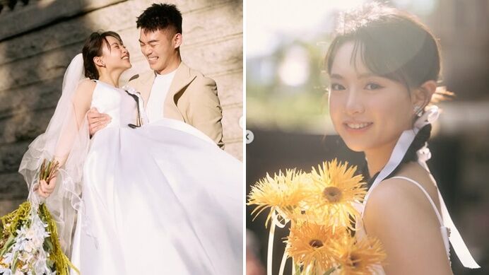 照片中,可以看到陳詩媛身穿細肩帶平口婚紗,後腦杓別上優雅白紗,手持精緻花束,被身穿米色西裝、笑容燦爛的王齊麟以「公主抱」之姿深情托起,流露出藏不住的喜悅。