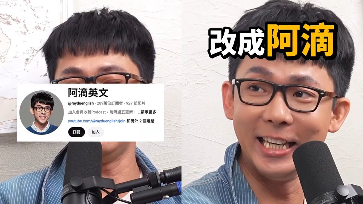 百萬YouTuber阿滴以英文教學影片起家,近年來頻道主題轉趨多元,今(10)日在社群上傳一段短片,宣布自己在今年要把頻道名稱「阿滴英文」精簡改名為「阿滴」,同時也曝光這背後的關鍵原因。