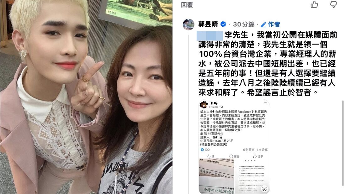 郭昱晴指出,早在去年她就已在公開場合說明過,丈夫於五、六年前曾任職於一家「100%台資」的台灣企業,以專業經理人身分領取台灣總公司的薪水,期間僅是短期出差,卻被外界不斷渲染成「賺紅錢」。她無奈表示,如今相關說法甚至被進一步放大,升級成她「家族」在中國大陸賺錢,讓她直呼荒謬。