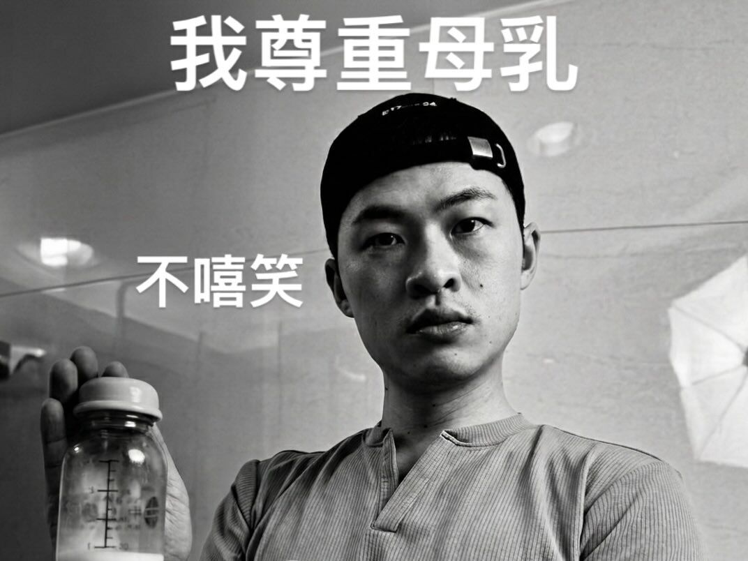同時楊昇達PO黑白色調的照片,表情嚴肅地直視鏡頭。他兩手托著一個裝有少量母乳的嬰兒奶瓶,且以大白文字配文:「我尊重母乳」、「不嘻笑」、「滴滴接的很辛苦」,表達自己的反省之意。