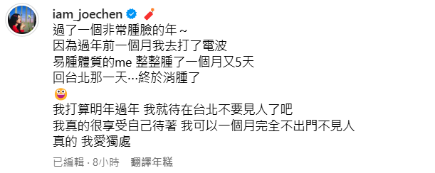 ▲陳喬恩透露過年前進廠維修。(圖/翻攝自Instagram/iam_joechen)