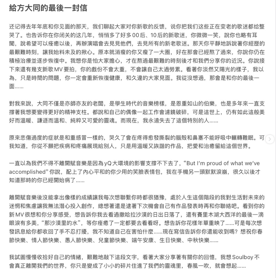 最後,孔藝弦寫道:「現在寫信告訴你,你還能收到嗎?」並在信尾列舉了一連串的節日祝福,從春節、情人節、兒童節到中秋節,彷彿想彌補過去未能說出口的話。她坦言,這封信對她來說寫得異常艱難,但看到大家紛紛分享與方大同的回憶,讓她覺得,這位影響無數人的音樂才子,並不會真正離開,「他只是變成了小小的碎片,住進了我們的靈魂裡,當春風吹起時,我們便會想起。」