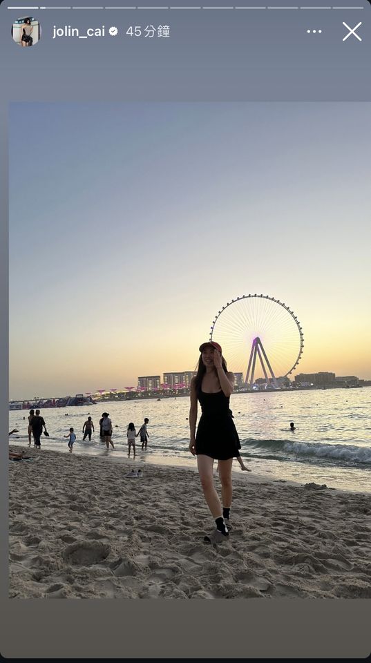 Jolin分享她在杜拜知名的「杜拜之眼」摩天輪附近海灘欣賞夕陽的照片,只見她穿著挖空的露背黑色細肩帶小洋裝,僅戴著帽子,完全沒有其他遮掩,笑容相當甜美,少女感十足,被讚根本像大學生。