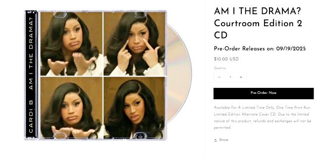 剛結束一場法院攻防戰的Cardi B,得開始忙著宣傳將在本月19日發行的新專輯,不只新專輯名稱叫《 AM I THE DRAMA?》,超符合她的近況,最新公開的3款專輯封面居然直接「把自己的法院表情包」用上了!讓網友們一度以為是粉絲製圖,結果確認是官網上架,紛紛爆笑留言:「名副其實的DRAMA QUEEN」、「好愛她的精神狀態」、「這會不會就是一場宣傳造勢?」。