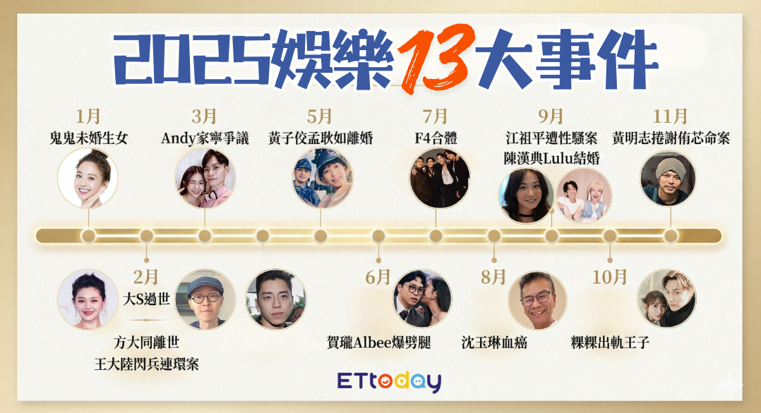 2025年進入尾聲,台灣娛樂圈也在這一年掀起各種從生離死別到桃色緋聞的巨大風暴,從年初的大S徐熙媛和方大同相繼離世,令大眾悲慟不已,但也不乏F4合體、陳漢典Lulu結婚等讓人看了心情暖暖的新聞,《ETtoday》整理了台灣娛樂圈2025年的13大事件,讓我們一起來回顧吧!