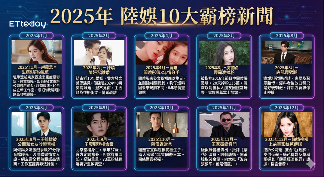 2025年大陸娛樂圈如驚濤駭浪,年初陳妍希陳曉宣布離婚,近10年婚姻畫句點;9月于朦朧墜樓猝逝,被網傳出黑幕陰謀;最曲折勵志的莫過於趙露思的逆風反擊,《ETtoday》整理了10大事件,一起來回顧2025年的大陸娛樂圈吧!