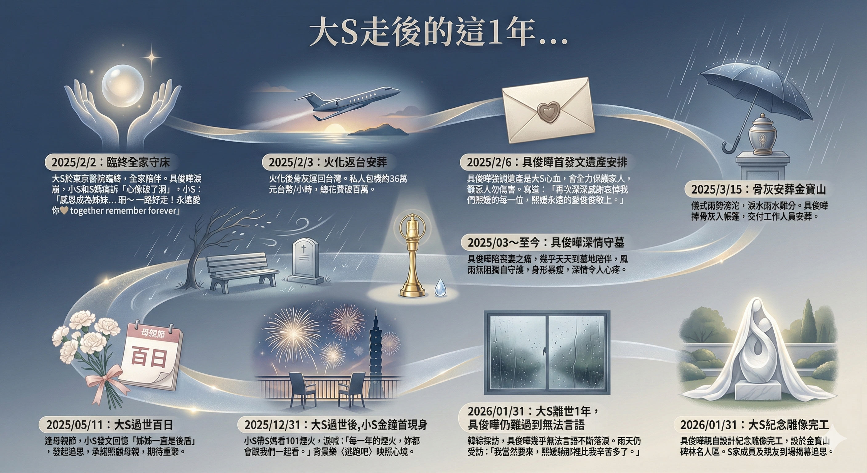 ▲回顧大S離世一周年,點圖可放大。(AI協作圖/記者田暐瑋製作,經編輯審核)