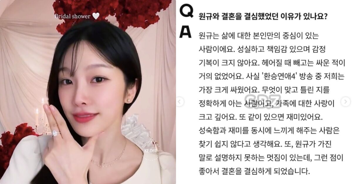 網路上同時也流出智賢的訪談內容,當被問到「下定決心與元奎結婚的理由是什麼呢?」的問題時,智賢認為元奎是一個很有主見的人,誠實、負責任、情緒穩定,她表示除了在分手以及節目拍攝期間,兩人基本上沒有大爭吵過,智賢:「他很重視家人、感情,我們在一起時的時候很開心,同時兼具純真與趣味的對象可遇不可求」,透露『因為這些部分想婚了!』不過還沒有正式官宣,坐等本人證實。