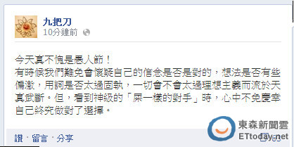 下午九把刀則有感而發地寫道「今天真不愧是愚人節!有時候我們難免會懷疑自己的信念是否是對的,想法是否有些偏激,用詞是否太過固執,一切會不會太過理想主義而流於天真武斷。但,看到神級的『屎一樣的對手』時,心中不免慶幸自己終究做對了選擇。」許多網友不禁揣測與「反反服貿」的千人上街頭抗議有關係。