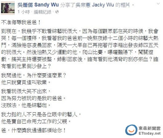 吳宗憲看著台灣綜藝節目長達50年來不斷地努力、成長,卻被金鐘評審一句「品質低落」否定,在臉書痛喊「汙辱我可以,汙辱整個綜藝圈就是不行。」28日凌晨,他的女兒吳姍儒也忍不住出來應援,不僅道出「綜藝咖」回到家的辛苦面,一句「不准侮辱我爸爸!」更讓眾網友不禁眼眶泛紅。