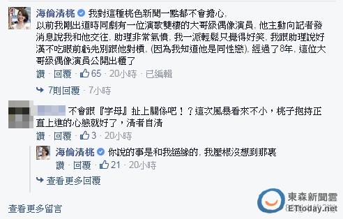 海倫清桃4日在臉書傾訴難過心情,透露前一晚收到圈內人的電話,難過到哭了一整夜,引發網友好奇是否跟「字母女星賣淫」扯上關係。不過,她隨後回覆網友留言:「你說的事是和我絕緣的,我壓根沒想到那裡。」並表示對桃色新聞毫不擔心,舉例剛出道時曾被一位「演歌雙棲的大哥級偶像演員」主動爆料交往,當時把助理氣壞了、自己卻只覺得好笑,因為她知道對方是位同性戀,果然8年後就見那位大哥級演員公開出櫃,引起網友熱議。