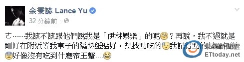 余秉諺12月初將車子送去貼上隔熱紙,等待之餘便找了家餐廳填飽肚子,沒想到他1日發現該店家竟在粉絲團寫下「凱渥經紀公司首席男模『余秉諺』微服私訪用餐」,讓他尷尬地在個人臉書說道:「呃…我該不該跟他們說我是『伊林娛樂』的呢?」