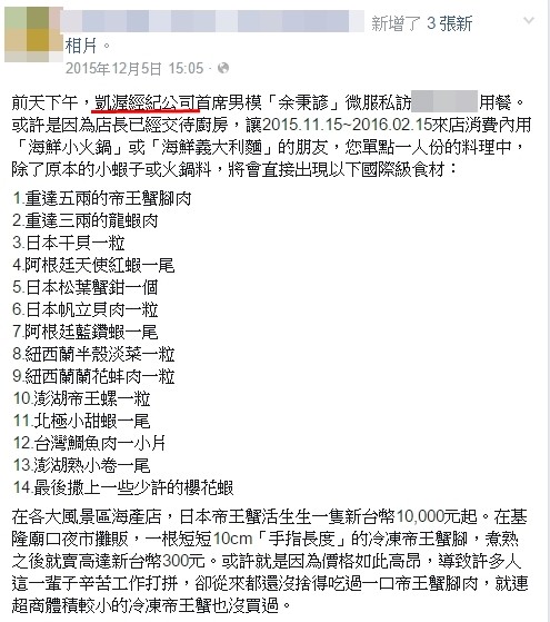 ▼店家在粉絲團貼出余秉諺用餐的消息。(圖/翻攝自臉書)