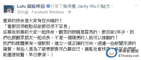 ▲LULU在臉書力挺吳宗憲,希望不要再有人用謠言中傷前輩。(圖/取自LULU臉書)