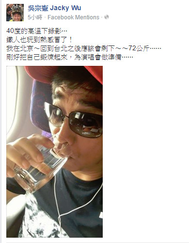 吳宗憲3日清晨在臉書上PO文,表示自己在北京錄影,他手拿著開水,直言在40度的高溫下錄影「鐵人也玩到熱感冒了」,也說自己經過這番折騰,回到台北,體重可能會降到72公斤,不過他不喊苦,還說「剛好把自己鍛煉起來,為演唱會做準備」,意外預告將開唱的計畫,雖然時間、地點,以及是否為個人演唱會都還未透露,但已引起粉絲熱烈討論,紛紛問:「要開演唱會了嗎?」、「由女兒來當嘉賓嗎?」也有許多人留言要憲哥保重身體。
