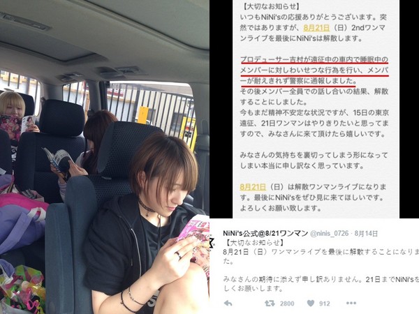 NiNi's於21日將迎接成軍1周年,原本預計要舉辦演唱會,近日卻透過官方推特發表聲明,表示眾人在長途車程中,製作人吉村雅樹竟猥褻正在熟睡的成員,令人無法忍受報警處理。該團沒有公布受害成員姓名,但是眾人討論結果決定解散,並說「現在還在精神不穩定的狀態」,不過敲定的表演活動仍決定登台,最後寫道:「最後的結果違反大家的心意,真的非常抱歉。」