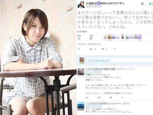 ▲NiNi's成員廣瀨那奈發表解散心情:「我太害怕,不想在這個圈子了!」(圖/翻攝自NiNi's推特)