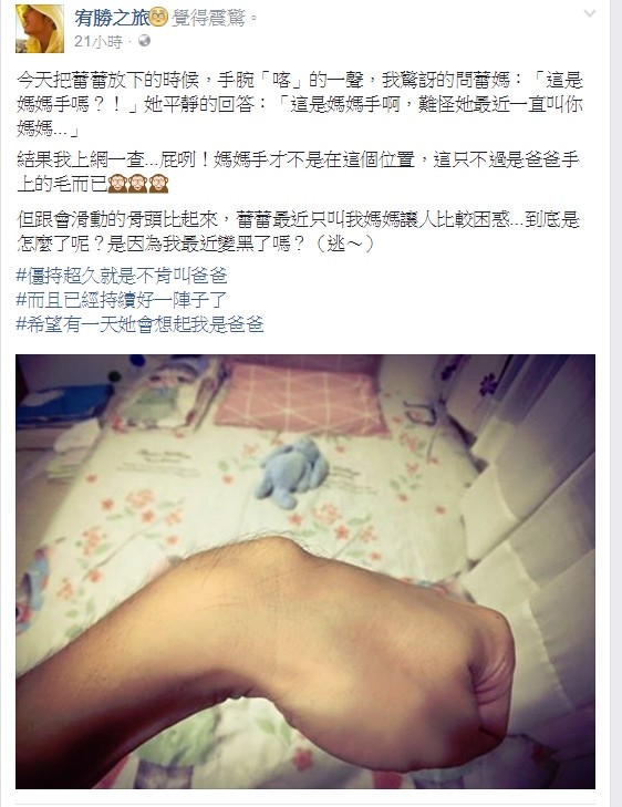 宥勝PO出左手腕的照片,手的關節竟長出一個圓形瘤,而且抱女兒時聽到「喀」的一聲,又被老婆說是媽媽手,嚇到趕緊上網查,才發現「只不過是爸爸手上的毛而已」。不過比起手腕的異狀,他更困惑愛女蕾蕾最近只喊自己「媽媽」,還搞笑自問是不是因為變黑,膚色越來越像老婆,才讓女兒傻傻搞不清楚。