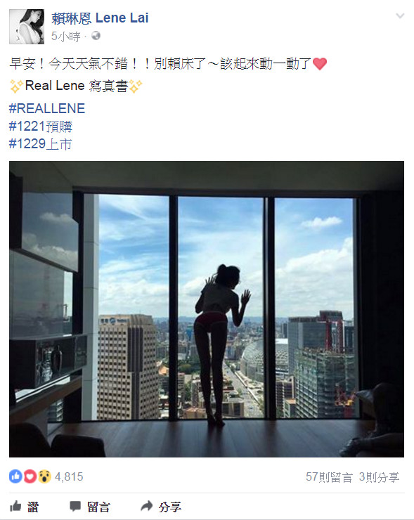 賴琳恩從模特兒跨足戲劇圈,在許多作品中獲得好評,近日即將發行寫真集,17日在臉書上傳照片,是她穿著粉紅內褲露大長腿的美照搶先看,讓許多粉絲心癢癢、更加期待寫真書發行的日子。