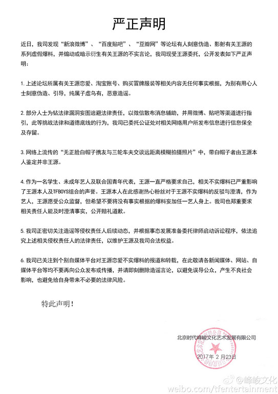 大陸男團TFBOYS成員王源日前被爆料戀愛消息,更傳出他私人的淘寶帳號,以及購買盜版衣服等傳聞,引起網路一陣熱烈討論,而所屬經紀公司23日對此做出了嚴正聲明。