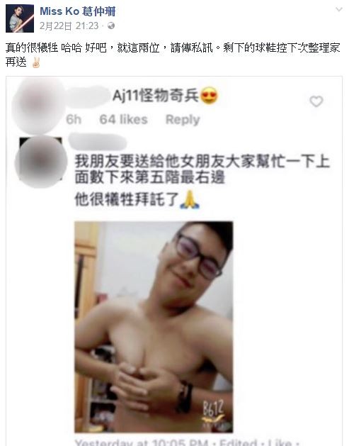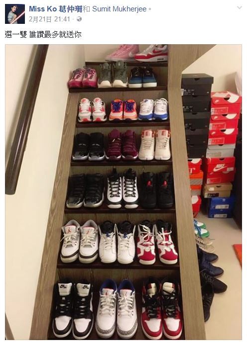 先前整理家裡,葛仲珊把整個樓梯排滿了球鞋,並且在臉書和IG上發文,要粉絲在底下留言;留言按讚數最多的粉絲,可以在圖片中選一雙鞋,直接獲得。沒想到貼文一出,短短1天內,吸引超過500位粉絲留言,讓她大喊:「哇靠!真的把球鞋控也都叫來了!」