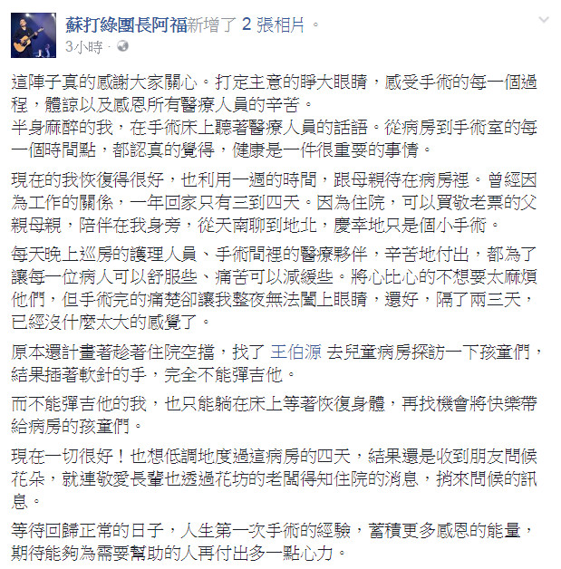 術後4天,阿福上傳1張插著軟針的手、以及祝福早日康復的花環,寫下長文和粉絲分享傷口恢復的狀況,以及心裡的感觸。他形容手術當下的情況,「半身麻醉的我,在手術床上聽著醫療人員的話語」,感謝醫院人員的辛苦付出,以及擔心的粉絲。