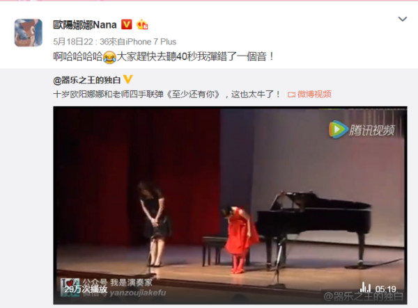 不過,歐陽娜娜本人看了這段影片後,卻不是那麼滿足,並沒有因為當時自己年幼而馬虎就忽略過錯,她看完將近5分半的鋼琴演奏後,轉發該影片表示「大家趕快去聽40秒我彈錯了一個音」,還配上一個笑哭的符號,對細節部分也是非常講究,並且向眾人坦承,讓網友們紛紛稱讚「彈錯了也沒什麼啦哈哈,一個很好的成長經驗」、「我們娜太耿直了」!